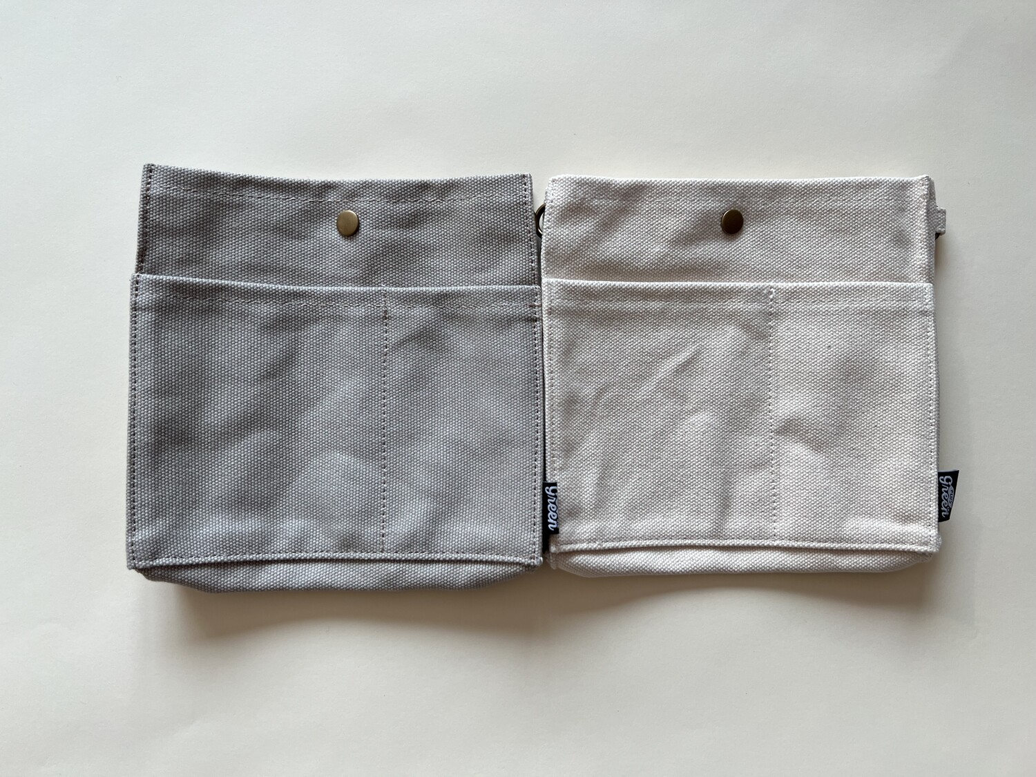 카키베이지 가방 속에 춉춉 가위 내추럴 컬러와 치카마사 와이드 가위를 넣은 모습입니다.